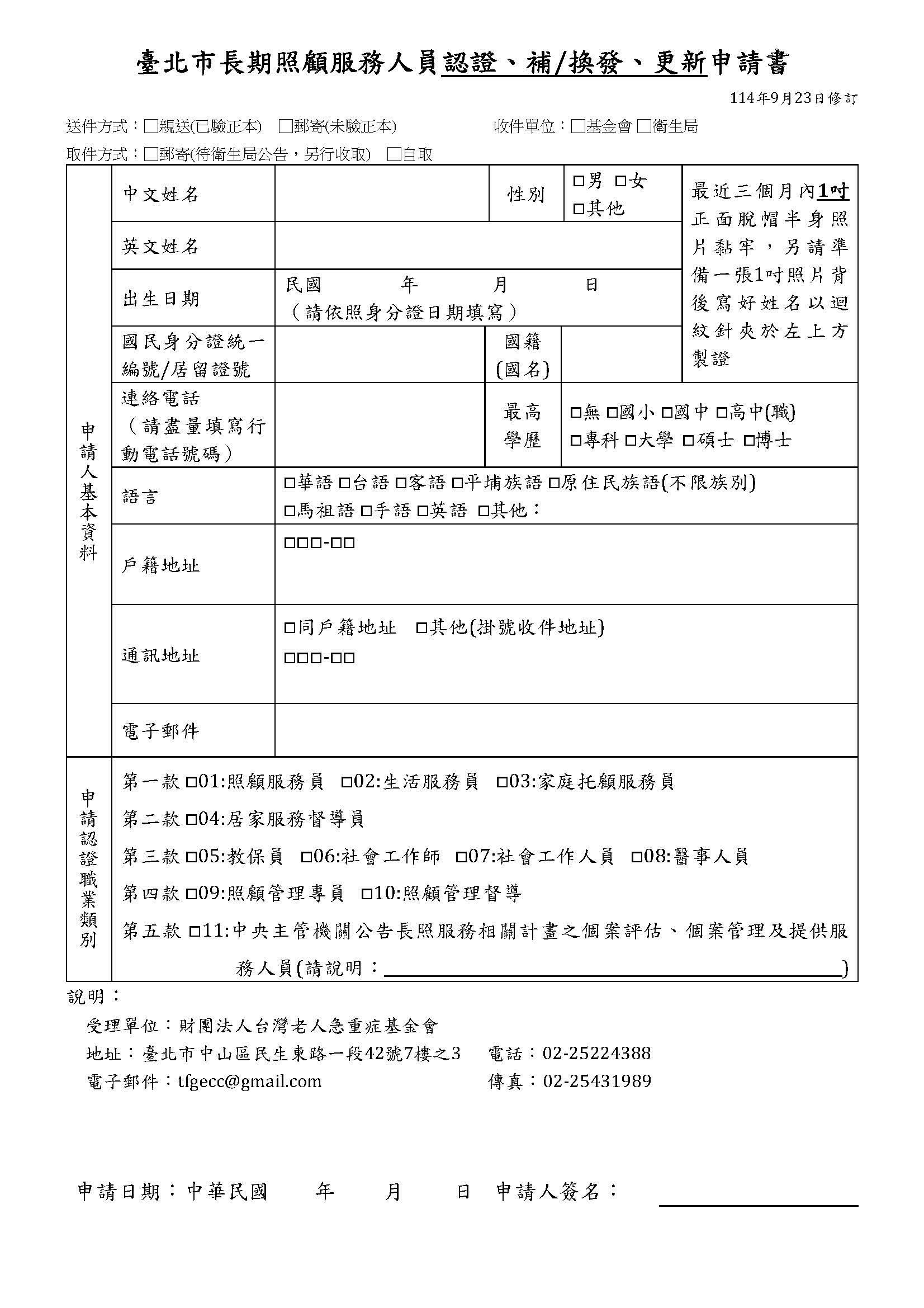 【申請書】臺北市長期照顧服務人員認證補換發更新「申請書」(含延展)